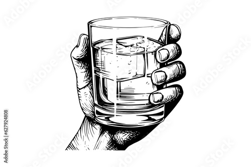 Hand holding glass with water isolated on white background. Cartoon style. Vector illustration for advertising, design
