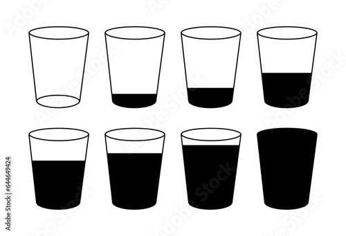 Set of simple vector different glasses. Glass marking. Grammar glass icons. Different glass filling. Empty glass or full glass or glass half filled, half empty glass. Bottling drinks, liquid or water