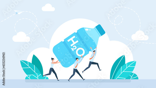 Tiny people carry a bottle of clean water in their hands. Water delivery service concept. Business illustration of courier service. Vector illustration.