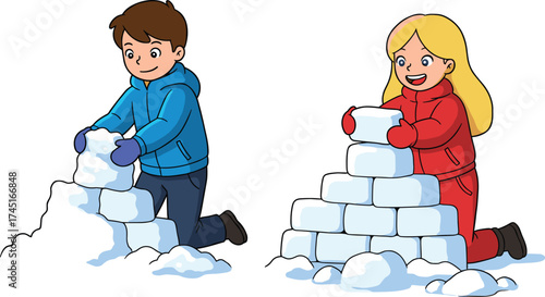 Children building a snowman together on a snowy winter day, creating happy memories.