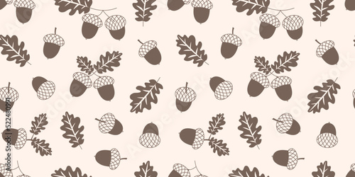 Acorn vector seamless pattern, brown autumn background, fall oak leaves texture. Nature simple illustration