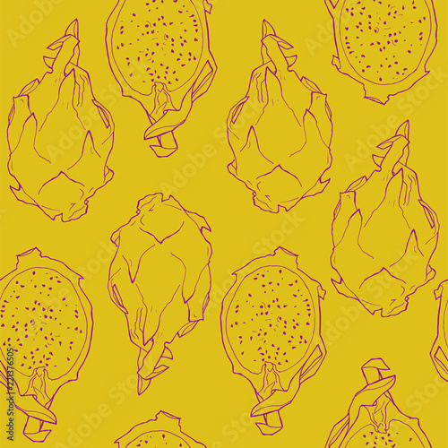 Hand drawn dragon fruit seamless pattern. Organic fresh food vector illustration. Retro pitaya fruit background.