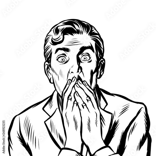 Shocked young man with wide open eyes and open mouth, vector illustration in retro pop art comic style
