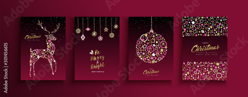 Merry Christmas and Happy New Year Set of greeting cards, holiday cover, invitation template. Modern Christmas bauble design with gold text. Minimalist vector template set for Christmas cards