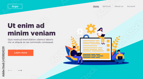 Tiny people developers at laptop and customer requirements. Software requirement description, user case agile tool, business analysis concept. Website vibrant violet landing web page template.