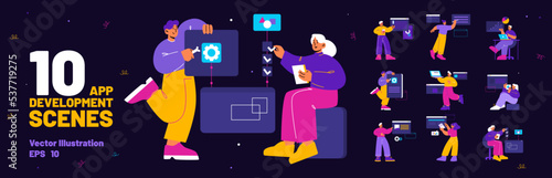 App development concept scenes set. Designer comes up with ideas, developers create interface of mobile application. Collection of people activities. Vector illustration of characters in flat design