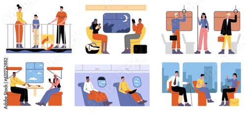 Passengers traveling by city metro train bus, vector illustration. People commuting to and from work by public transport