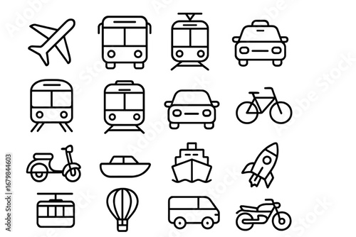 Outline transport icons showcasing vehicles like buses, trains, taxis, and bikes for modern transit apps and urban mobility projects