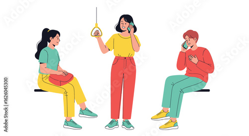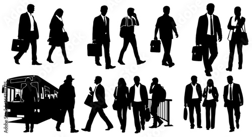 Silhouettes of people walking, talking, waiting at bus stops, using smartphones, carrying bags, urban lifestyle, commuting, public transport, city life