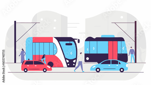 Various modes of transportation are illustrated, showcasing choices for commuting in a modern city setting