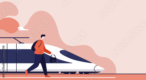 Illustration of people boarding a train, depicting public transportation and commuting.