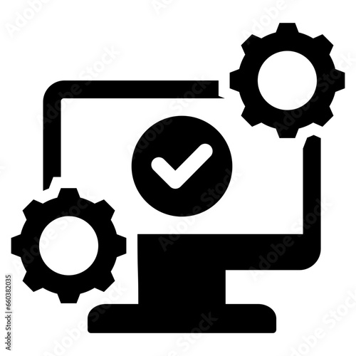 Gear icon with check mark as completed update settings vector or cog wheel checkmark as setup executed change graphic pictogram isolated, digital installed construction approved pinion cogwheel image