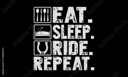 Eat. Sleep. Ride. Repeat. - Farrier T-Shirt Design, Hand drawn lettering phrase, Isolated on Black background, For the design of postcards, cups, card, posters.