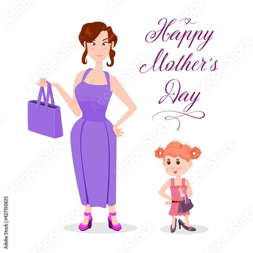 Daughter in mom's shoes with a bag next to mom, happy mother's day.