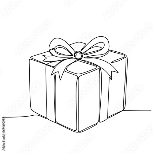 Continuous one-line drawing of a wrapped gift box with a bow, symbolizing celebration, surprises, and special occasions in a clean, minimalist outline on a white background.
