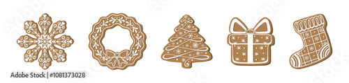 Christmas gingerbread cookies collection. Simple flat vector icons of baked gingerbread men, girl, Santa Claus, deer, snowflake, snowman, present, mitten, bell, Santa hat and other holiday symbols
