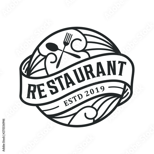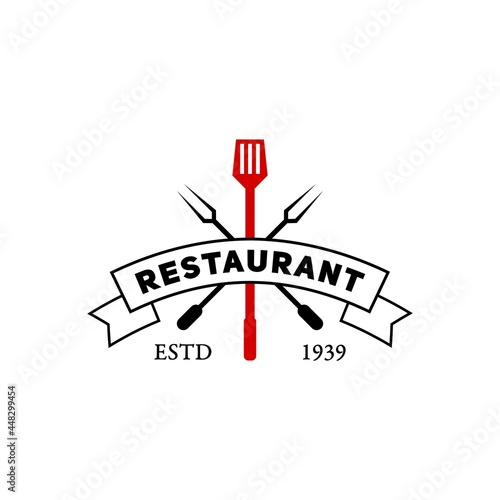 restaurant logo with fork and spatula object. online shop logo and chaf logo