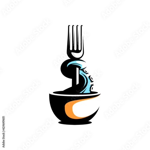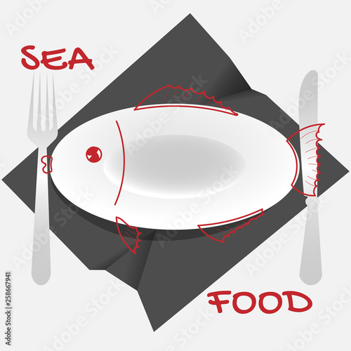 logo of sea food restaurant with a plate in the form of fish and cutlery on a crumpled napkin