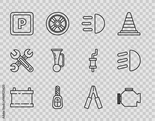 Set line Shock absorber, High beam, Gear shifter, Steering wheel, Car battery jumper power cable, Check engine, Funnel and oil drop and Speedometer icon. Vector
