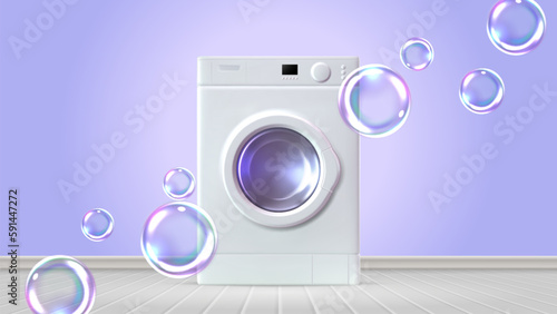 Interior with washing machine and soap bubbles. Realistic vector illustration