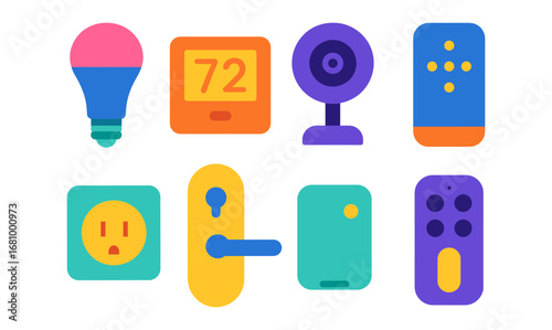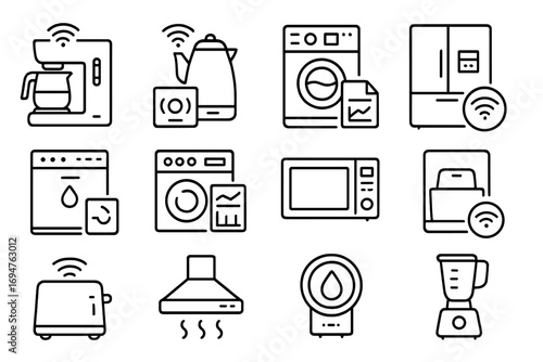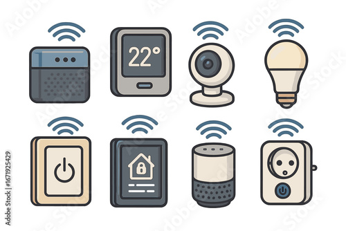 Smart home device icons showcase modern living, perfect for interface design, appliance guides, and innovative product promotions in sleek, scalable vector style.