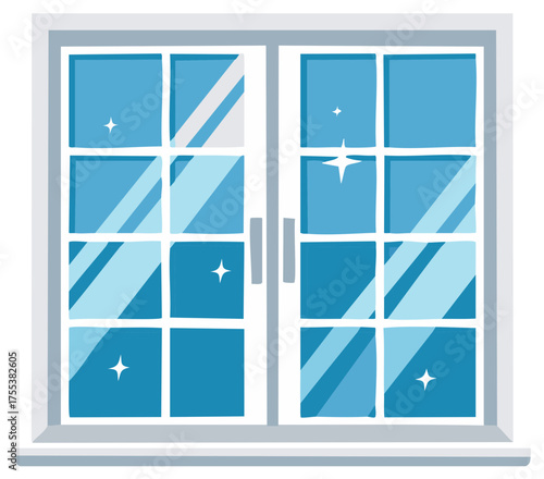 Shiny house window with bright clear blue glass and a pristine white frame illustration