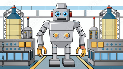In a household a small round robot is scurrying around the kitchen. Its round body is covered in a bright red metal casing and it has two small yellow. Cartoon Vector.