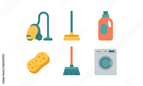 A clean, modern illustration depicts a mop, bucket, and cleaning symbol. Bright, stylized design with sparkling effects. Perfect for cleaning, hygiene, and home themes.