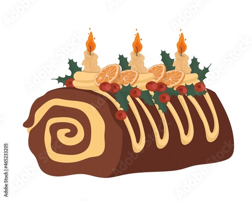 Festive yule log cake. Delicious Christmas yule log, perfect for holiday celebrations.  Sweet treat, winter dessert.