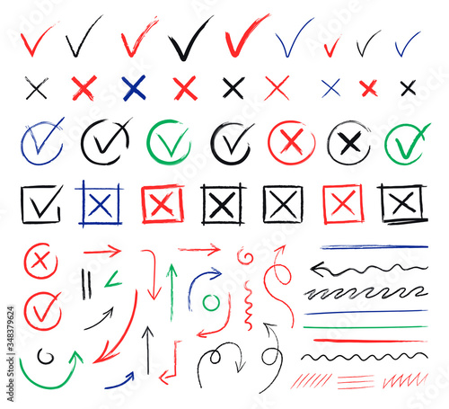 Doodle check marks and underlines. Hand drawn red strokes and pen markings V marks for list items. Vector marker check handwritten signs and checkbox