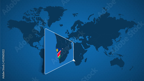Detailed world map with pinned enlarged map of Namibia and neighboring countries.