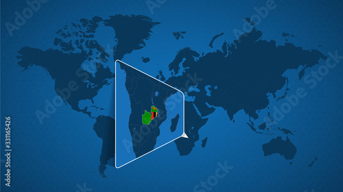 Detailed world map with pinned enlarged map of Zambia and neighboring countries.