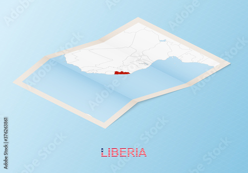Folded paper map of Liberia with neighboring countries in isometric style.