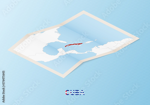 Folded paper map of Cuba with neighboring countries in isometric style.