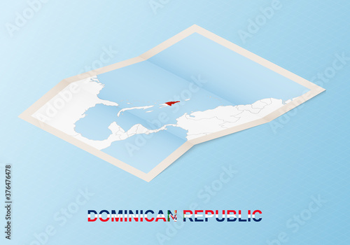 Folded paper map of Dominican Republic with neighboring countries in isometric style.