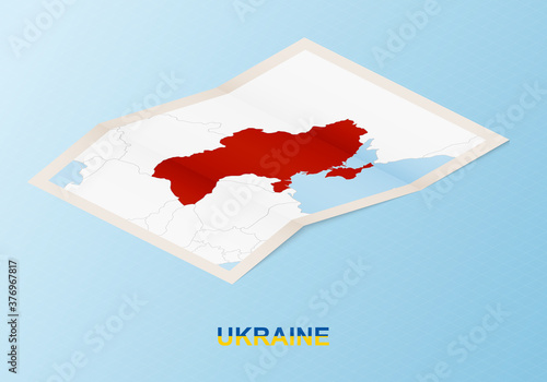 Folded paper map of Ukraine with neighboring countries in isometric style.