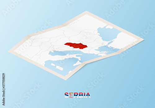 Folded paper map of Serbia with neighboring countries in isometric style.