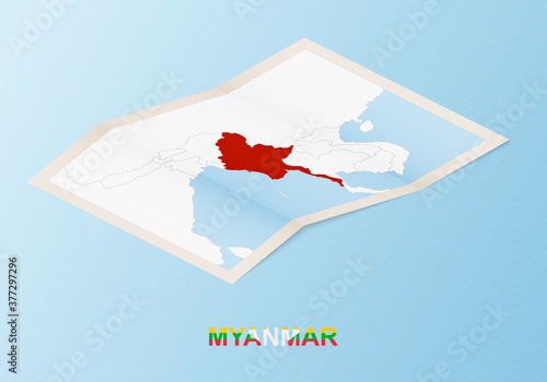 Folded paper map of Myanmar with neighboring countries in isometric style.