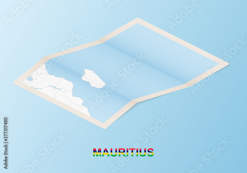 Folded paper map of Mauritius with neighboring countries in isometric style.