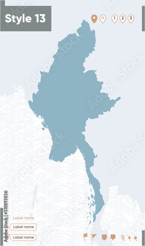 Myanmar - map with water, national borders and neighboring countries. Shape map.
