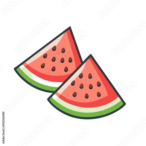 Two cute and stylized triangular slices of juicy watermelon with black seeds, illustrated with colorful striped patterns.