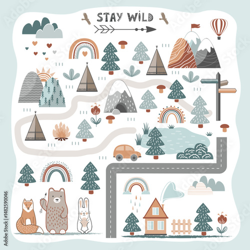 Hands and feet hopscotch game. Yellow background with multitude of footprints. Activity floor game. Hand and footprint. Game elements for fun active. Fun active game with start and finish
