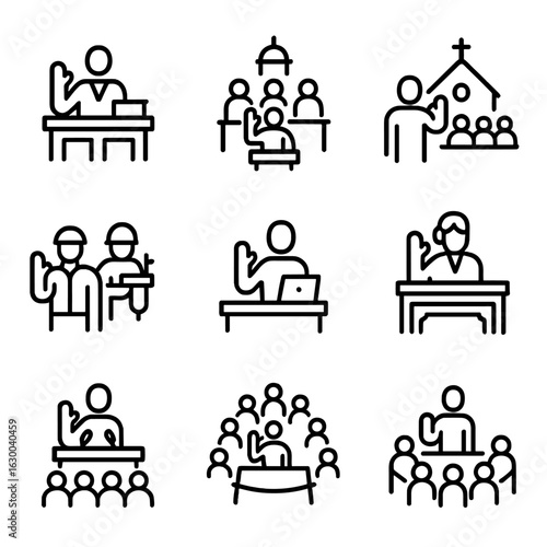 Set of line icons related to presentation, meeting, business, discussion. Outline icons collection. Editable stroke. Vector illustration.