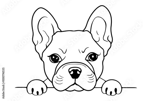 a black and white line drawing of a French Bulldog puppy sitting in a toy wagon