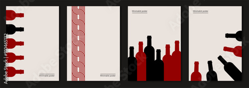 Vector illustration depicting bottles of wine. Restaurant menu. Set of minimalist posters design in red and black colors. Abstract wall art.
