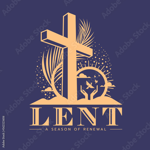 Lent, a season of renewal banner with crucifix on the hill in sunset and purple sky vector design