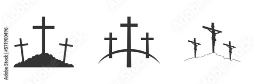 Good friday Easter vector illustration greeting card - Black silhouette of Crucifixion of Jesus Christ in Golgota / Golgotha jerusalem israel, with three crucefix crosses on rock