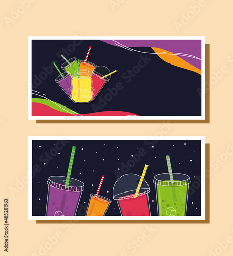 Set of fruit smoothies in plastic glasses. Healthy fresh juice. Menu drinks. Vector