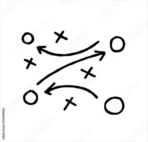 Sports tactics and strategy. Scheme of movement of team player. Combination of crosses and circles with path arrows