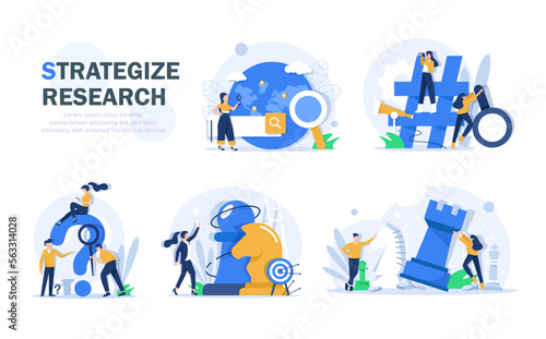 Business strategy vector illustrations set. Concept of analyzing project, financial report and strategic thinking, analytics in finances, market research